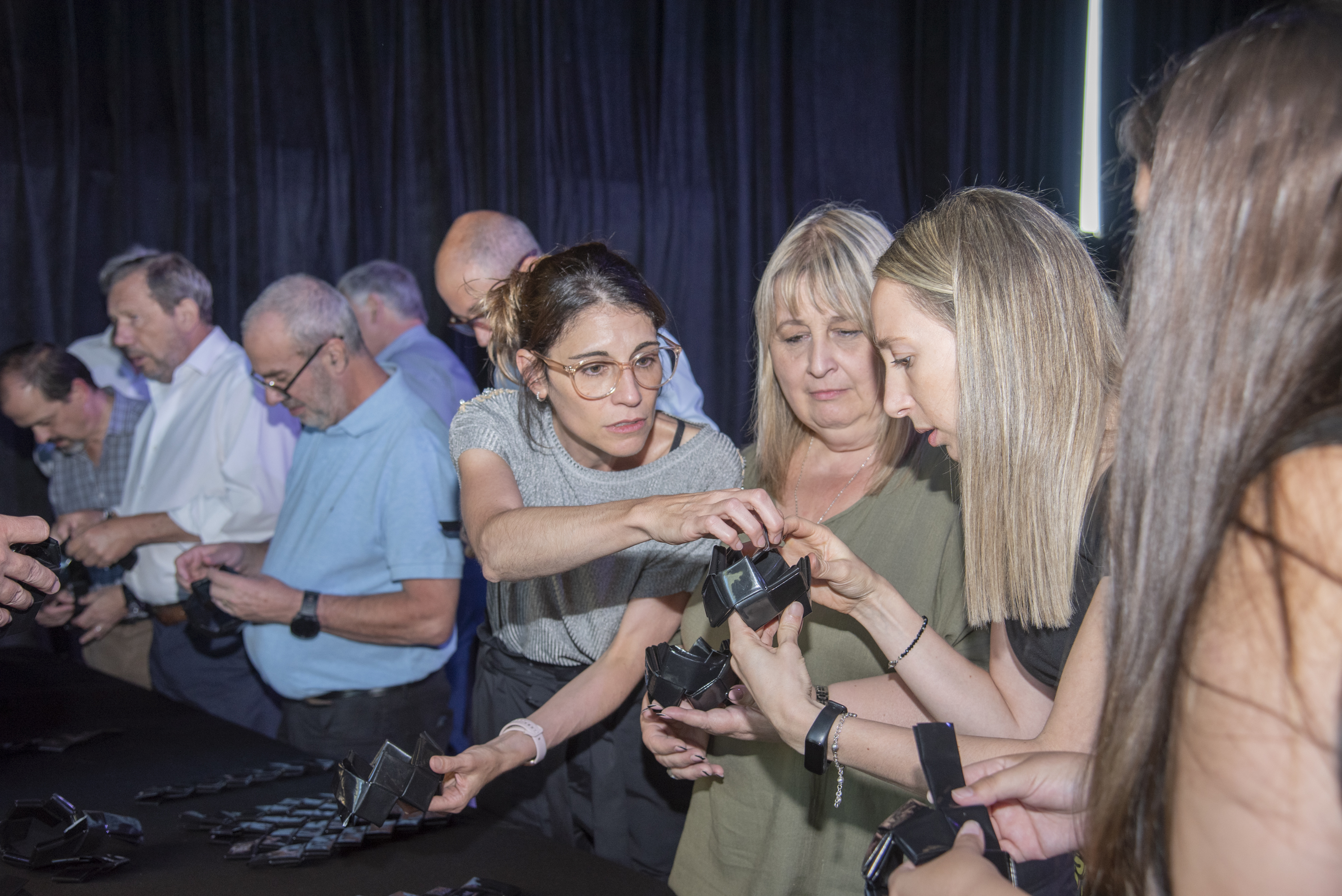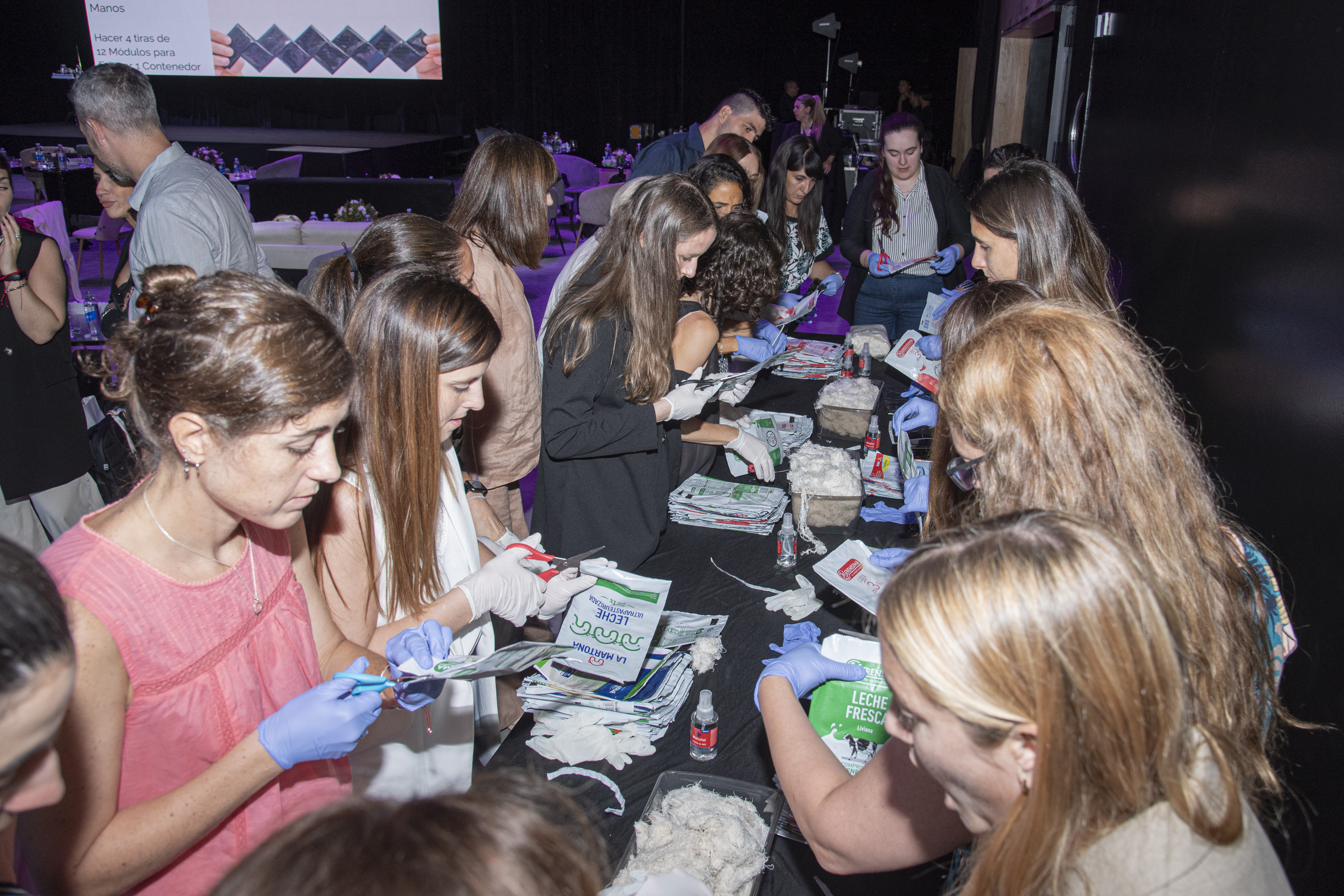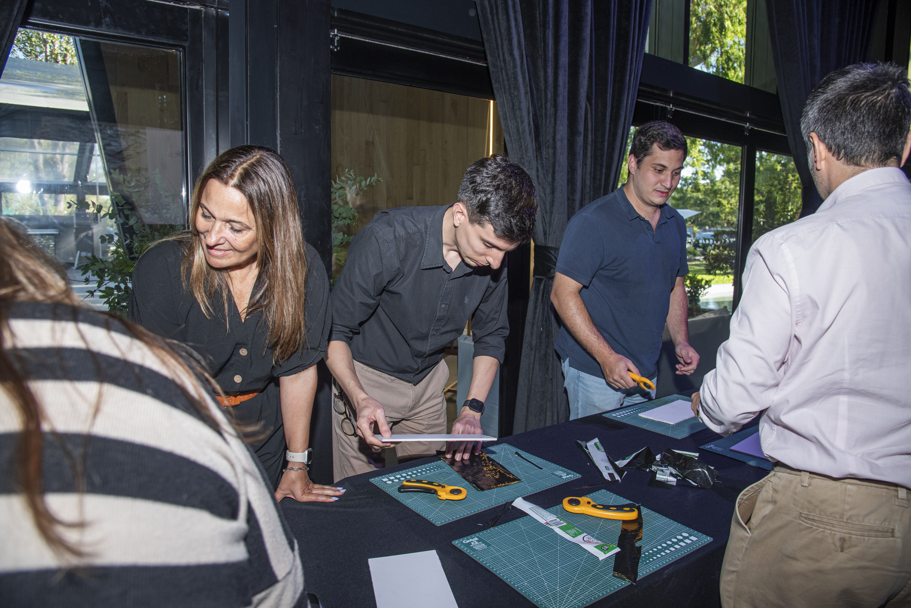 Durante el workshop, los participantes trabajan en estaciones de trabajo (islas) organizadas por tareas específicas del proceso productivo de productos BIOTICO —como bolsos, carteras u objetos de diseño sustentable—.